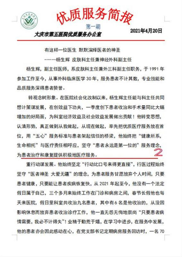 大庆市第五医院优质服务简报第二期